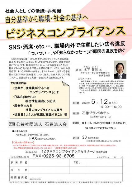 令和4年5月12日(木)石巻グランドホテルにて、「自分基準から職場・社会の基準へ~ビジネスコンプライアンス」セミナーを開催し、会員企業より7名が参加しました。
