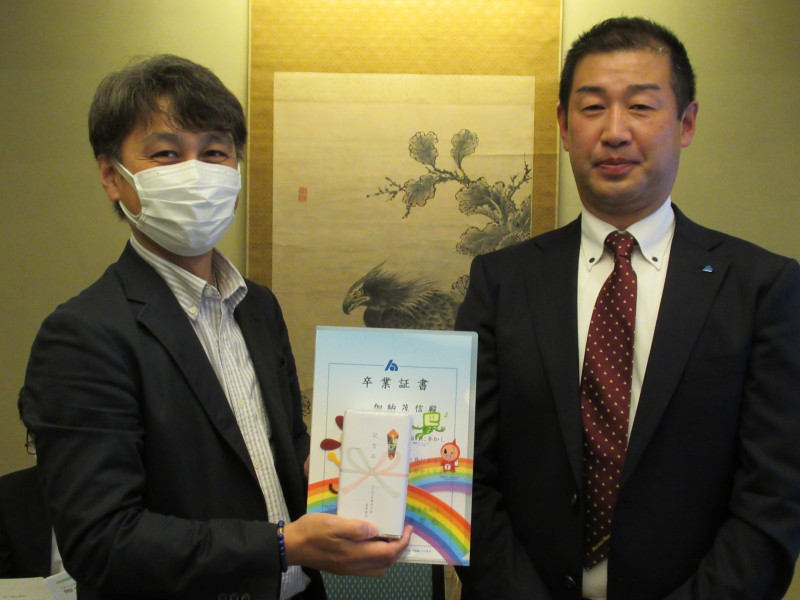 続いて、第2部「令和4年度優良経理員表彰」と「令和3年度会員増強功労者表彰」が行われました。当日ご出席いただきました4名の皆さんへ松本会長より表彰状と記念品をお渡ししました。