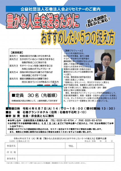 令和4年6月7日(火)石巻グランドホテルにて、「豊かな人生を送るためにおすすめしたい5つの捉え方」セミナーを開催致します。